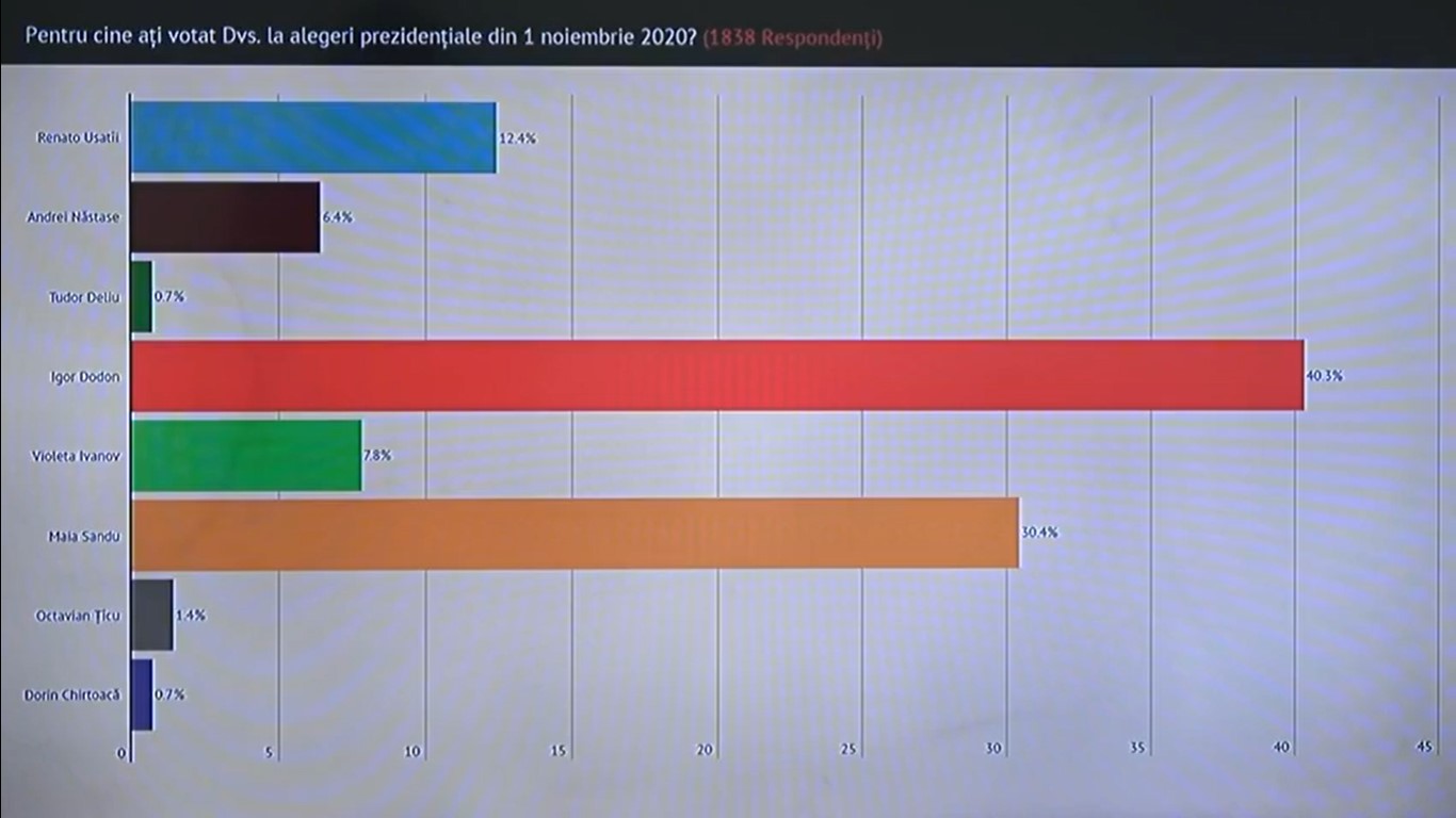 Potrivit datelor prezentate de WatchDog.md și Institutul de Politici Publice Igor Dodon, a obținut 40,09%. Pe al doilea loc s-a situat candidata PAS, Maia Sandu-34,6%, fiind urmată de candidatul Partidului Nostru, Renato Usatîi cu 11,5%. Marja de eroare a exit-poll-ului telefonic este de +/- 2,5%, iar rata de refuz este de 37%.