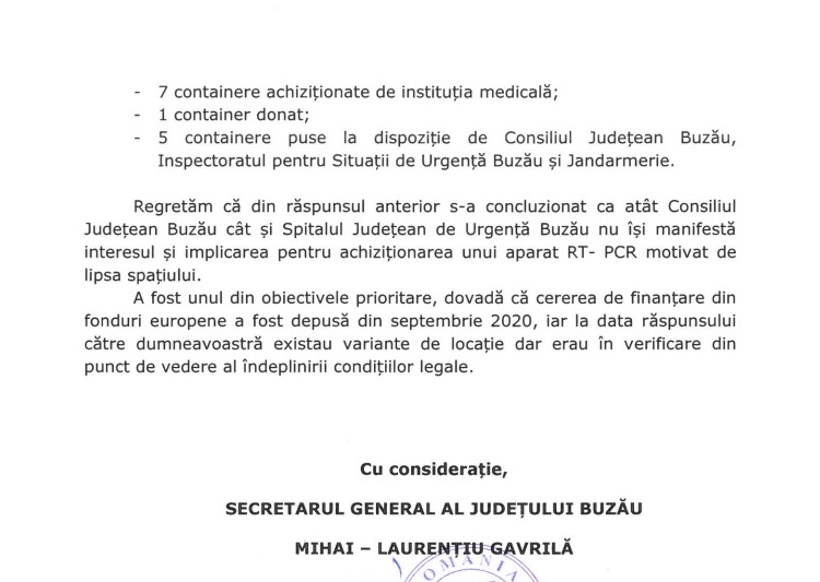 De asemenea, reprezentanții Consiliului Județean Buzău, județul în care niciun spital nu are vreun aparat de testare PCR la aproape 10 luni de la debutul epidemiei de coronavirus în România, mai spun că „regretă” faptul că din răspunsul lor anterior, formulat tot în urma unei interpelări a deputatului USR Emanuel Ungureanu, „s-a concluzionat că atât Consiliul Județean Buzău cât și Spitalul Județean de Urgență Buzău nu își manifestă interesul și implicarea pentru achiziționarea unui aparat RT-PCR motivat de lipsa spațiului.”