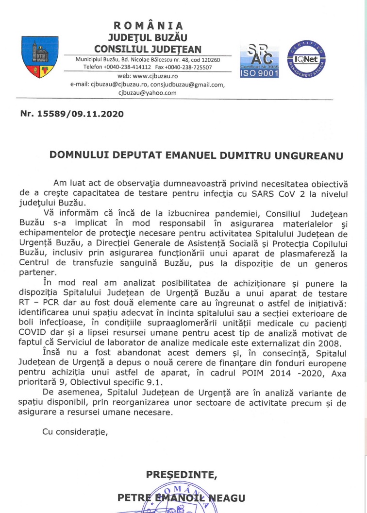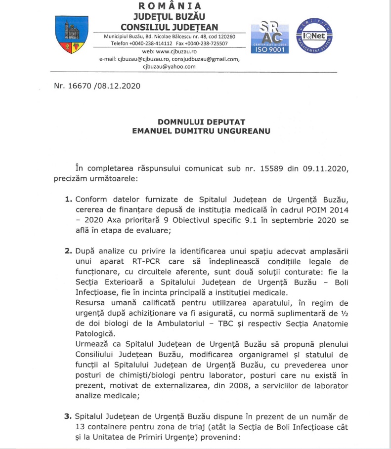 Într-un răspuns la o interpelare formulată de Emanuel Ungureanu, deputatul USR Buzău și vicepreședintele Comisiei de Sănătate din Camera Deputaților, Consiliul Județean Buzău arată că a găsit două soluții pentru amplasarea unui aparat de testare, dar nu s-a hotârât încă pe care dintre ele să o aleagă. În plus, aparatul nu este în acest moment achiziționat. „După analize cu privire la identificarea unui spațiu adecvat amplasării unui aparat RT-PCR care să îndeplinească condițiile legale de funcționare, cu circuitele aferente, sunt două soluții conturate: fie la Secția Exterioară a Spitalului Județean de Urgență Buzău – Boli Infecțioase, fie în incinta principală a instituției medicale”, arată Consiliul Județean Buzău, într-un răspuns la o interpelare formulată de deputatul USR Emanuel Ungureanu, vicepreședintele Comisiei de Sănătate din Camera Deputaților.