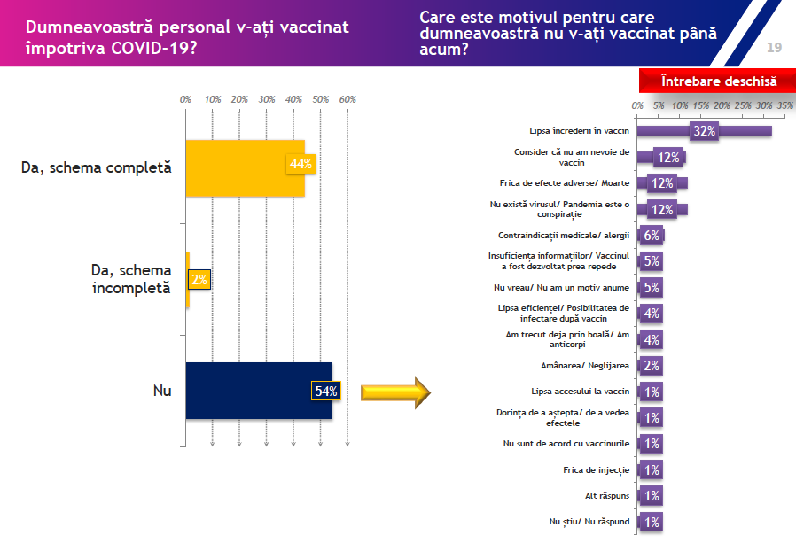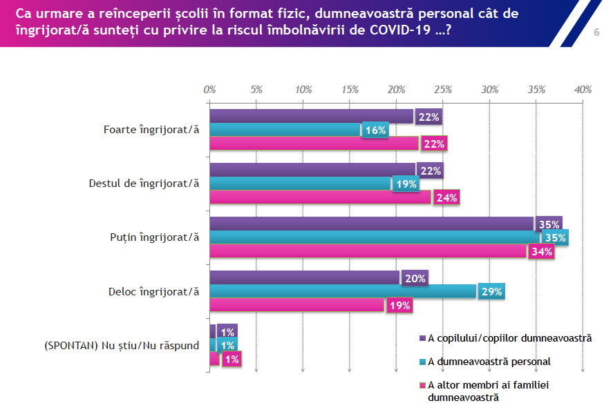 Potrivit sondajului, făcut pe un eșantion de 1000 de părinți, cu o marjă de eroare +/- 3%, 54% dintre respondenți nu s-au vaccinat, iar 55% dintre ei sunt fie deloc, fie puțin îngrijorați de perspectiva îmbolnăvirii cu COVID-19.