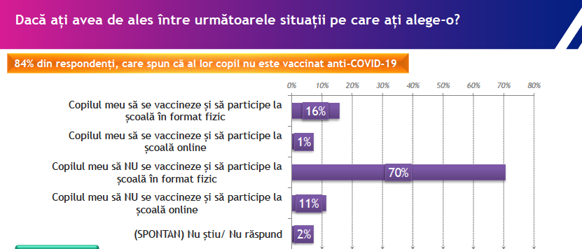 Dacă ar avea posibilitatea de a alege, 80% dintre părinții elevilor cu vârsta între 12 și 18 ani care nu sunt, până în prezent, vaccinați împotriva COVID-19 ar alege pentru copiii lor ca aceștia să nu fie imunizați: 70% ar dori ca aceștia să participe la școală în format fizic, neimunizați fiind, iar 10% ar dori pentru copiii lor neimunizați să participe la școală în format online.