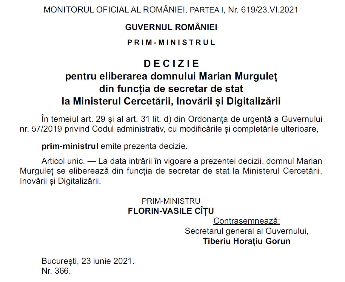 Decizia eliberării lui Marian Murguleț din funcția de secretar de stat în Ministerul Cercetării, Inovării și Digitalizării, condus de Ciprian Teleman, a fost semnată și publicată miercuri, 23 iunie, în Monitorul Oficial, la nici o zi după ce premierul Cîțu semnase numirea sa în această poziție.