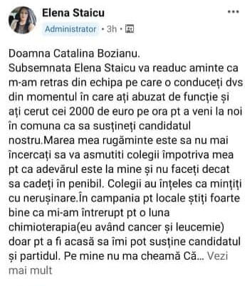 Subsemnata Elena Staicu va readuc aminte ca m-am retras din echipa pe care o conduceți dvs din momentul în care ați abuzat de funcție și ați cerut cei 2000 de euro pe ora pentru a veni la noi în comuna ca sa susțineți candidatul nostru.