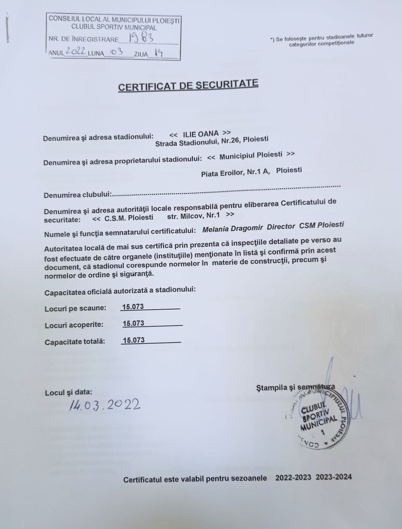 ”În calitate de administrator al stadionului “Ilie Oană”, Clubul Sportiv Municipal Ploieşti a finalizat demersurile privind obţinerea Certificatului de Securitate pentru următorii doi ani, astfel că arena îndeplineşte toate criteriile necesare pentru organizarea de meciuri oficiale în sezoanele competiţionale 2022-2023 şi 2023-2024.