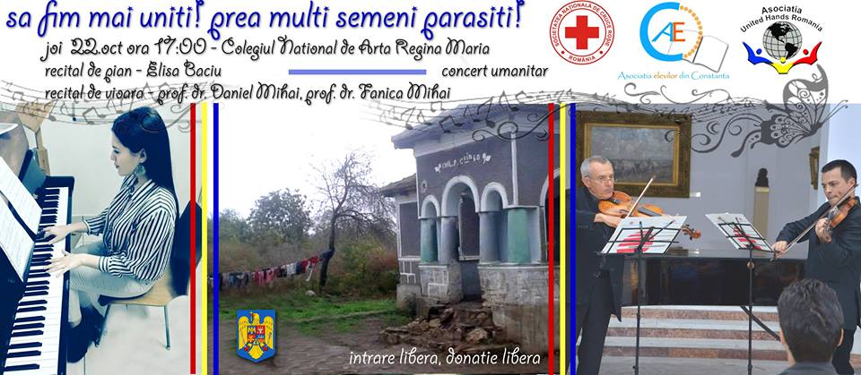 Va aducem la cunostinta ca in data de joi 22 octombrie 2015 ora 17:00 in sala Sergiu Celibidache din cadrul Colegiului National de Arte „Regina Maria” din Constanţa va avea loc concertul umanitar – ,,Sa fim mai uniti! Prea multi semeni parasiti!”