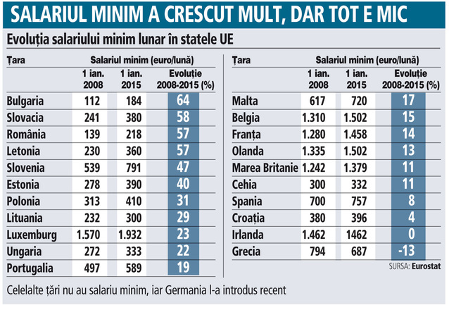 Revenind ” cu picioarele pe pământ” în această țară blagoslovită de Dumnezeu,nu pot să rămân impasibil la „măreața” creștere și să mă întreb, pe bună dreptate oare ce pot face beneficiarii cu acești bani? Nu prea multe, dacă ținem cont de un alt aspect. Dintre cele 22 de ţări europene în care există un salariu minim, cea mai mică leafă este în Bulgaria- echivalentul a 214 euro, iar cea mai mare în Luxemburg- 1.923 euro.