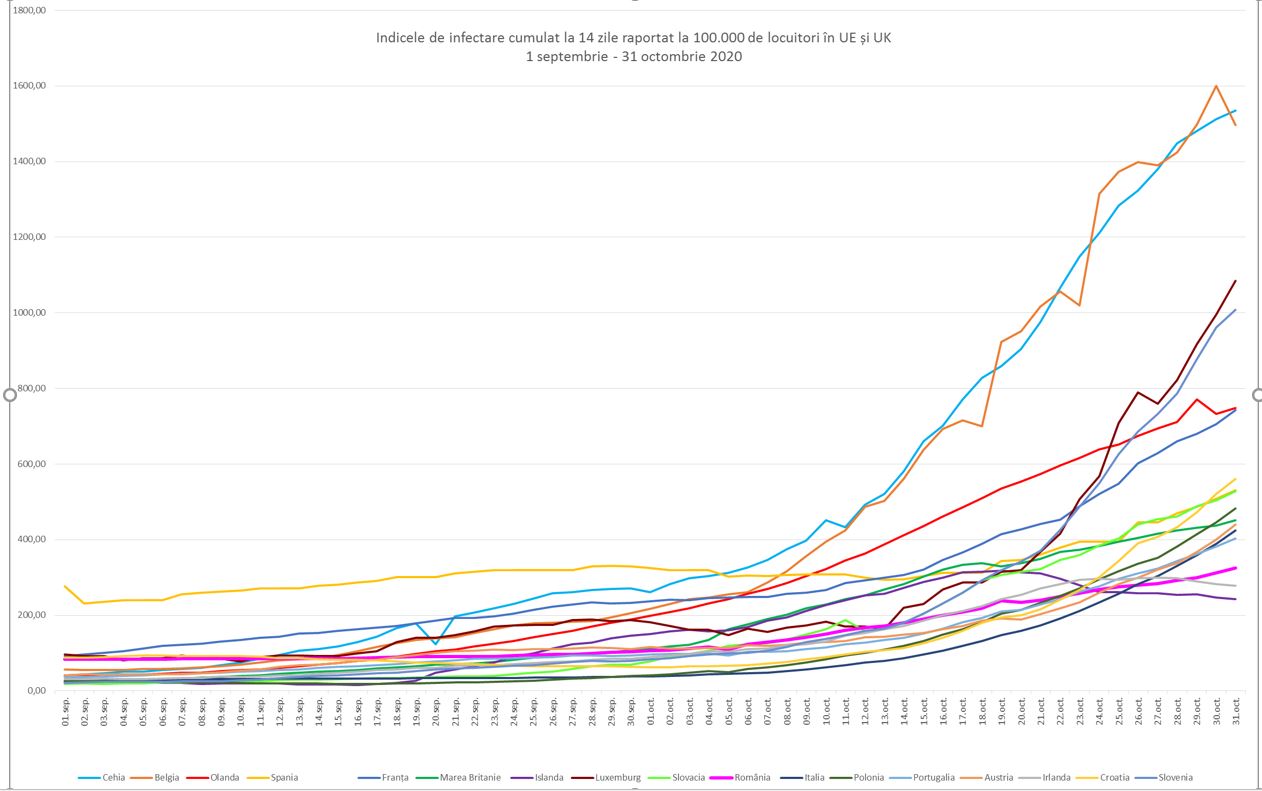 Țara noastră are, astfel, un indice de infectare de 324,9, potrivit unei situații comparative privind evoluția numărului de cazuri, cumulate la 14 zile, raportată la 100.000 de locuitori în diferite state din Europa, în intervalul 1 septembrie – 31 octombrie 2020. Sursa datelor este Centrul European de Prevenire și Control al Bolilor.