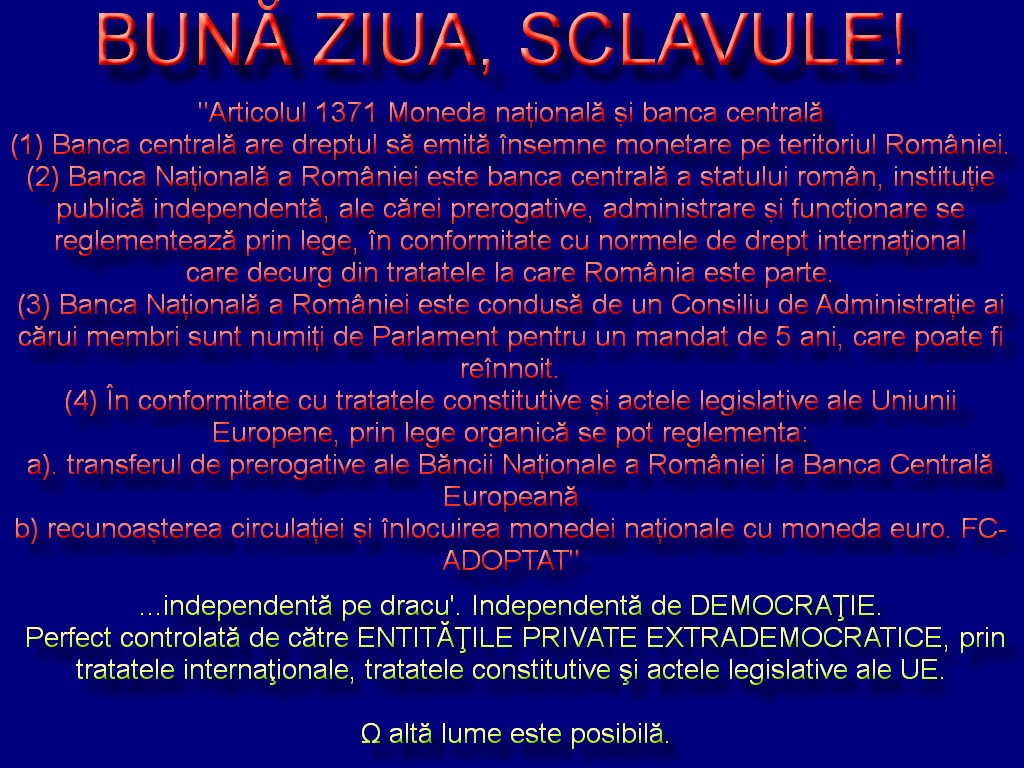 Am așteptat o reacție din partea adevăratului guvernator al coloniei acesteia (România)- Mugur Isărescu care de 27 de ani se află în funcţie şi practic controlează circuitul tuturor finanţelor din această ţară! Dar, ca şi cum nimic nu s-a petrecut, reacţia nici nu a întârziat să apară!