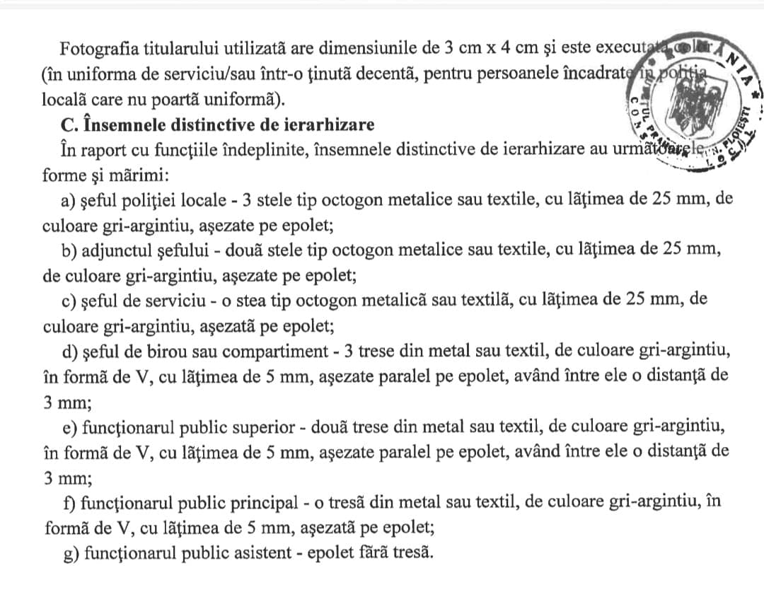1. Seful politiei locale – 3 stele tip octogon metalice sau textile, cu latimea de 25 mm, de culaore gri-argintiu, asezate pe EPOLET;…