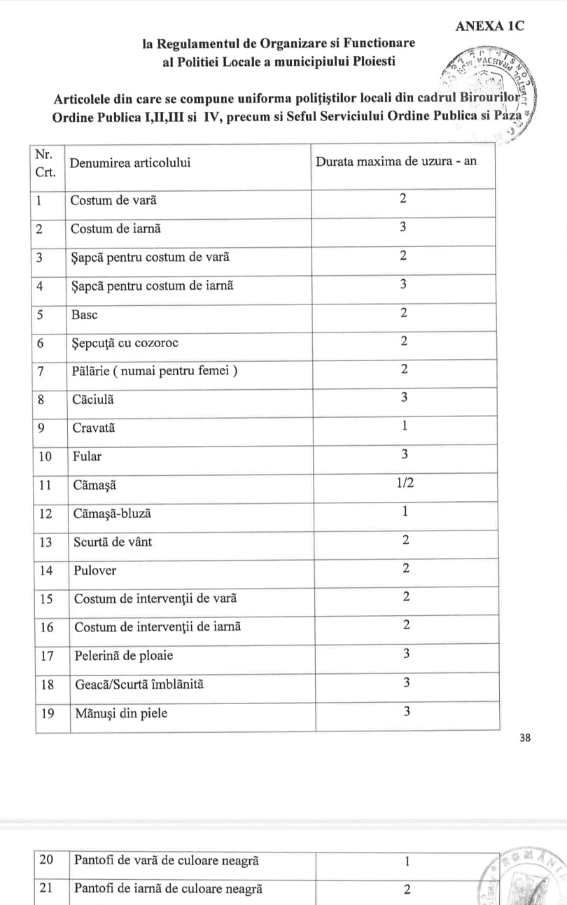 In anexa 1D se prezinta „descrierea uniformei de serviciu, a legitimatiei de serviciu si a insemnelor distinctive de ierahizare ale POLITISTILOR LOCALI si ale PERSONALULUI CONTRACTUAL cu atriburii in domeniul pazei bunurilor si a obiectivelor de interes local” (pag 48).