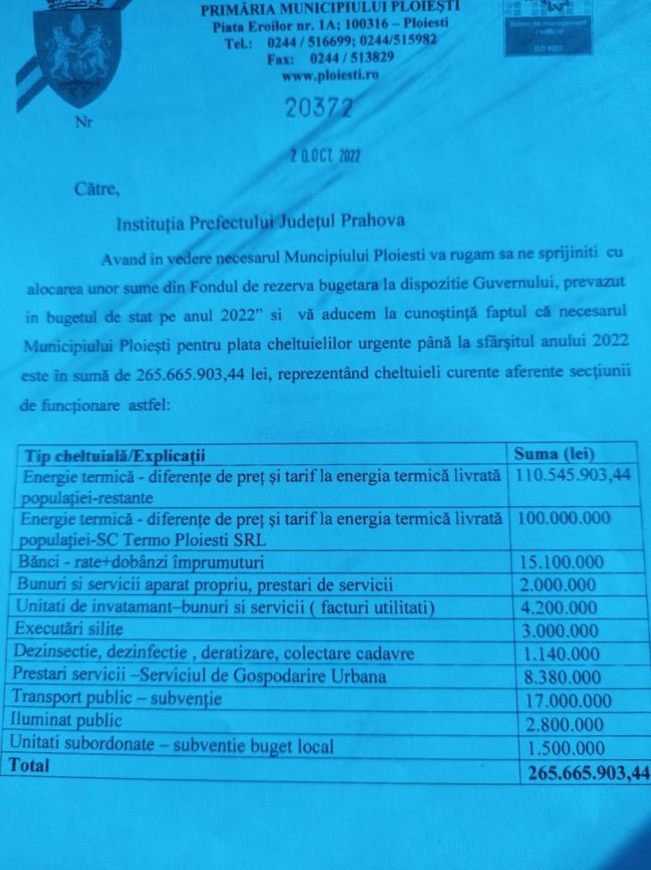 Aproape 266 de milioane de lei este suma solicitată de Primăria Ploieşti din fondul de rezervă al Guvernului, suma din care i s-a aprobat zero lei!