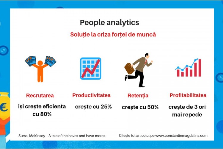 Potrivit McKinsey, companiile care folosesc analiza datelor privind angajații își cresc cu 80% eficiența în recrutare, cu 25% productivitatea și cu 50% rata de retenție.