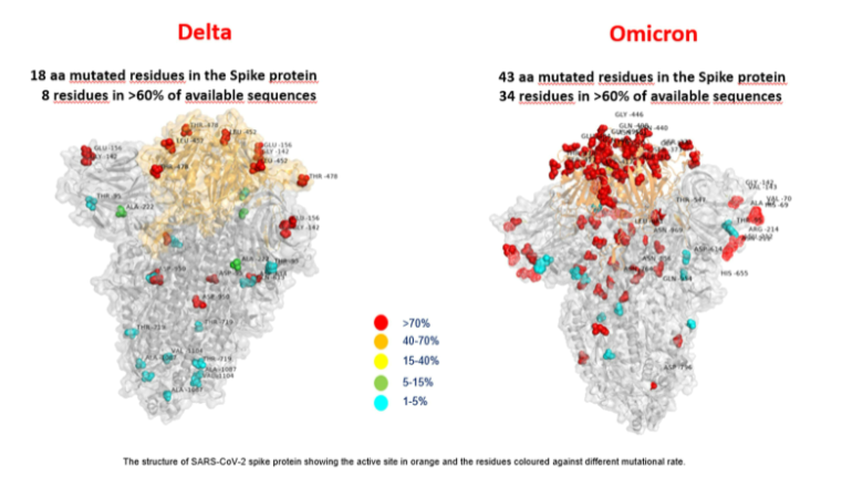 Pe această „imagine” tridimensională, care arată ca o hartă, „se vede clar că varianta Omicron prezintă mult mai multe mutații decât varianta Delta (care prezintă deja ea însăși un număr mare de mutații), concentrate mai ales într-o singură – zona proteinei care interacționează cu celulele umane”, a spus echipa de cercetători într-un comunicat duminică.