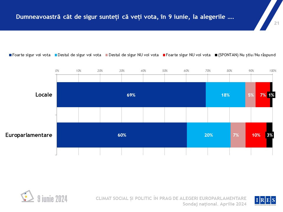 Sondajul arată că 60% dintre participanții la studiu declară că sigur vor vota la europarlamentare, față de 69% care declară că vor merge cu siguranță să își exprima votul pentru alegerile locale.