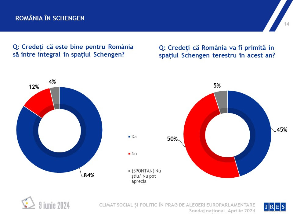 Peste 80% dintre participanții la sondajul IRES cred că este bine ca România să fie în Schengen și cu frontierele terestre, însă doar 45% cred că există, în mod real, această posibilitate, în timp ce restul cred contrariul.
