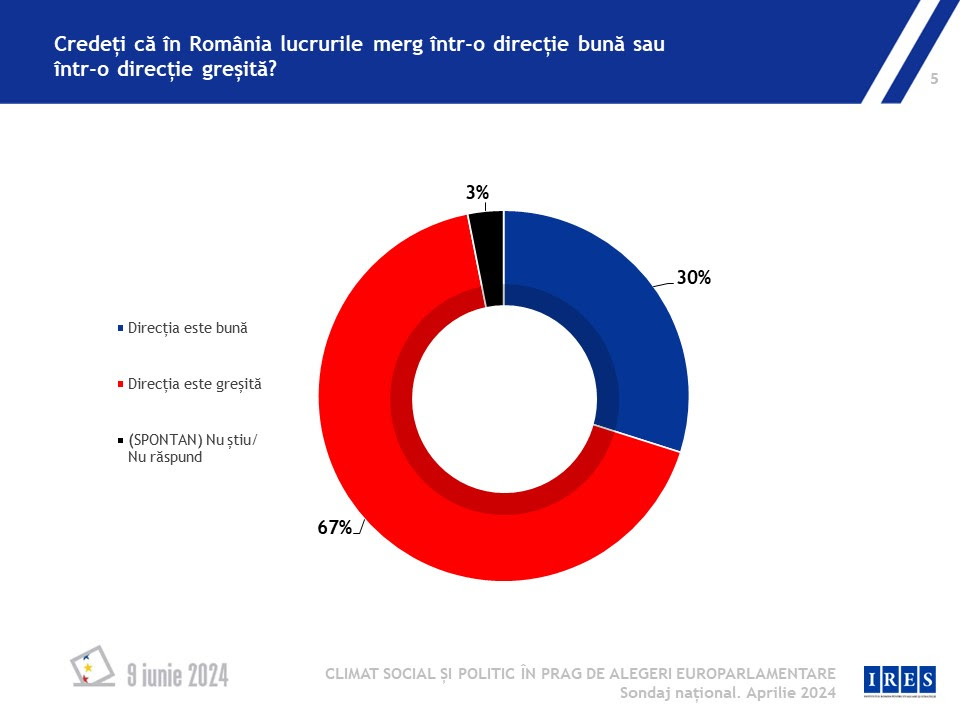 Un indicator cu trend pozitiv a fost numărul persoanelor care cred că România se îndreaptă spre o direcție greșită. Dacă în octombrie 2023 procentul ajungea la 76%, la începutul lunii aprilie a scăzut la 67%.