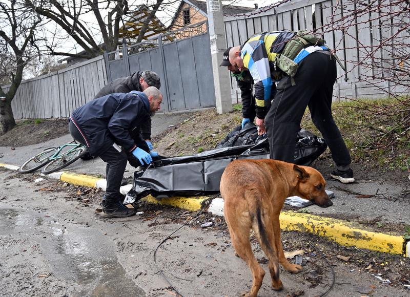 Trupul unui civil ucis de rusi este ridicat de catre ucraineni in BuchaFoto: Sergei Supinsky / AFP / Profimedia Images