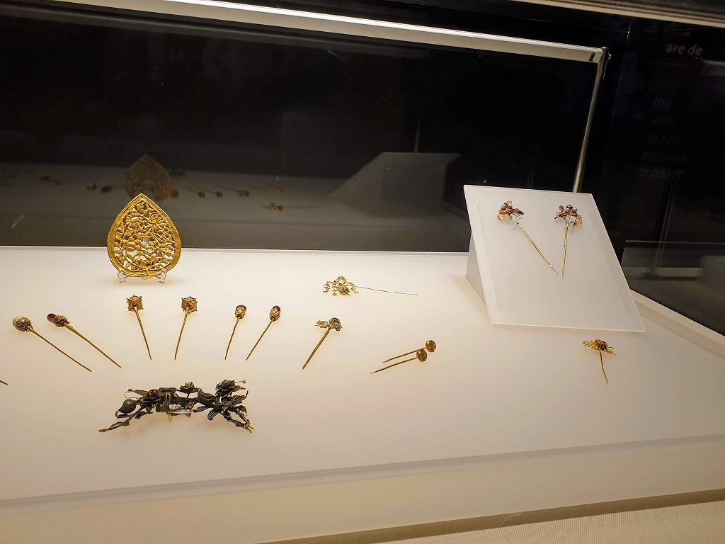Sunt prezentate ace de păr, cercei și brățări, vase utilizate în cadrul ritualurilor religioase, vase pentru servirea băuturilor, dar și seturi de coșuri cu flori, obiecte pur decorative împodobite cu motive animaliere și vegetale care exprimă urări de sănătate, bogăție și longevitate.