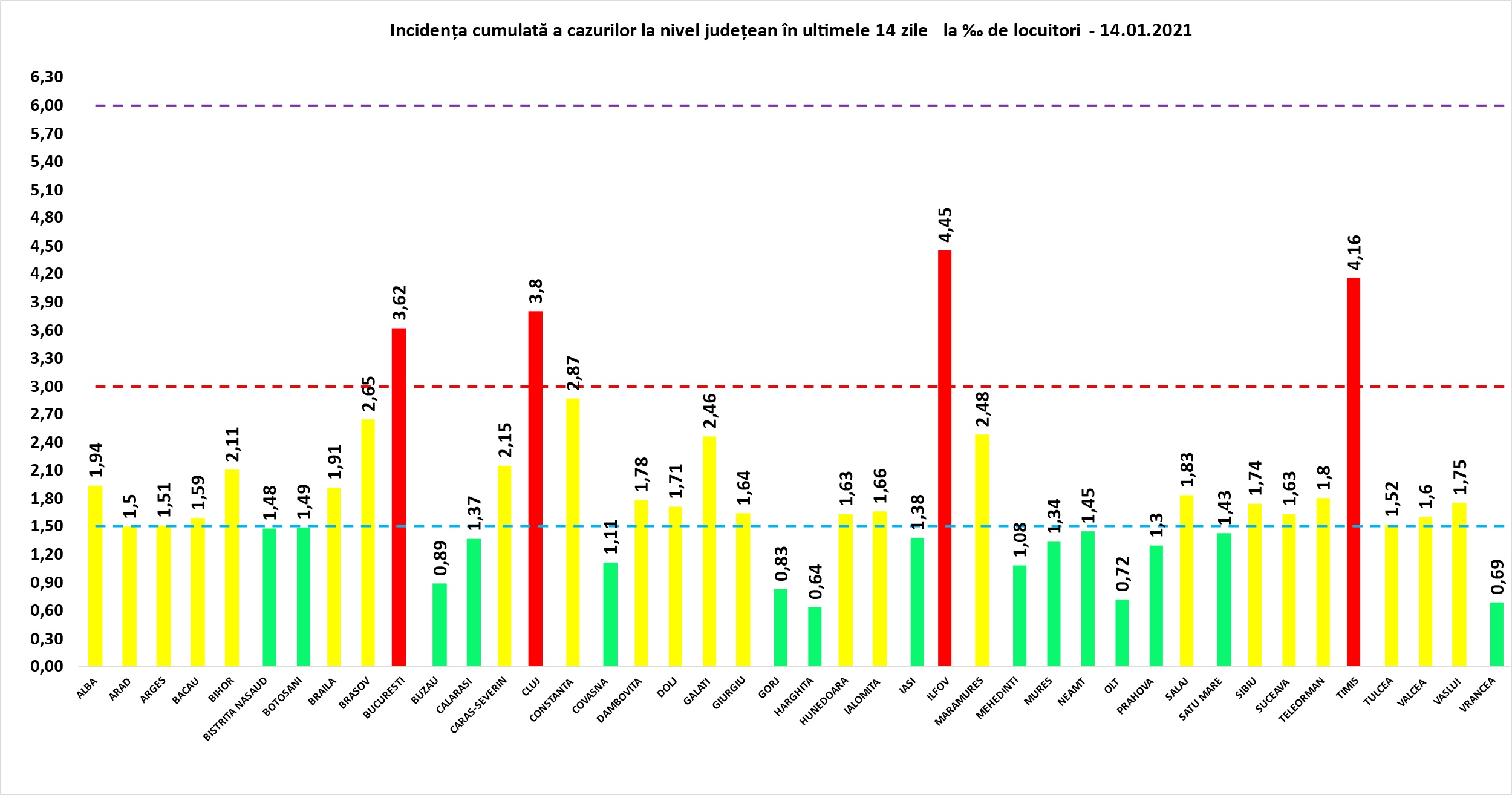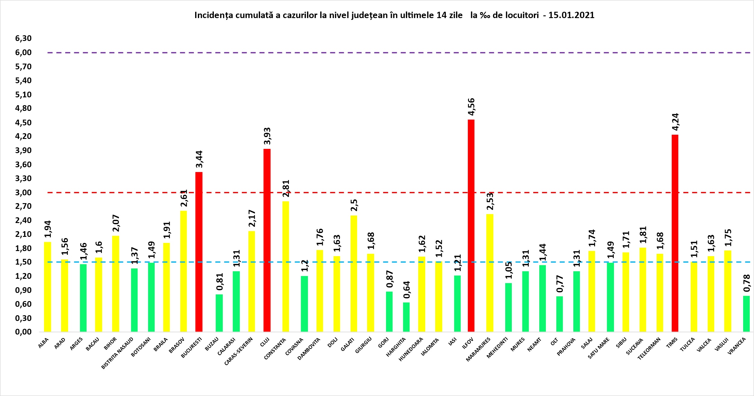 În „zona roșie” de Covid-19 se află vineri trei județe și Bucureștiul. După Ilfov, cea mai mare rată de infectare se înregistrează în Timiș (4,24 / 4,16 ieri), urmat de Cluj (3,93 / 3,8, ieri) și București (3,44 / 3,62 ieri).