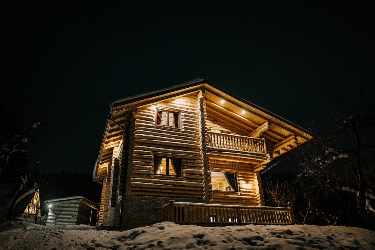 Cabana este construită din lemn rotund, are o capacitate maximă de 12 persoane și dispune de 5 camere duble, 4 băi, un living spațios prevăzut cu șemineu și o bucătărie complet utilată.
