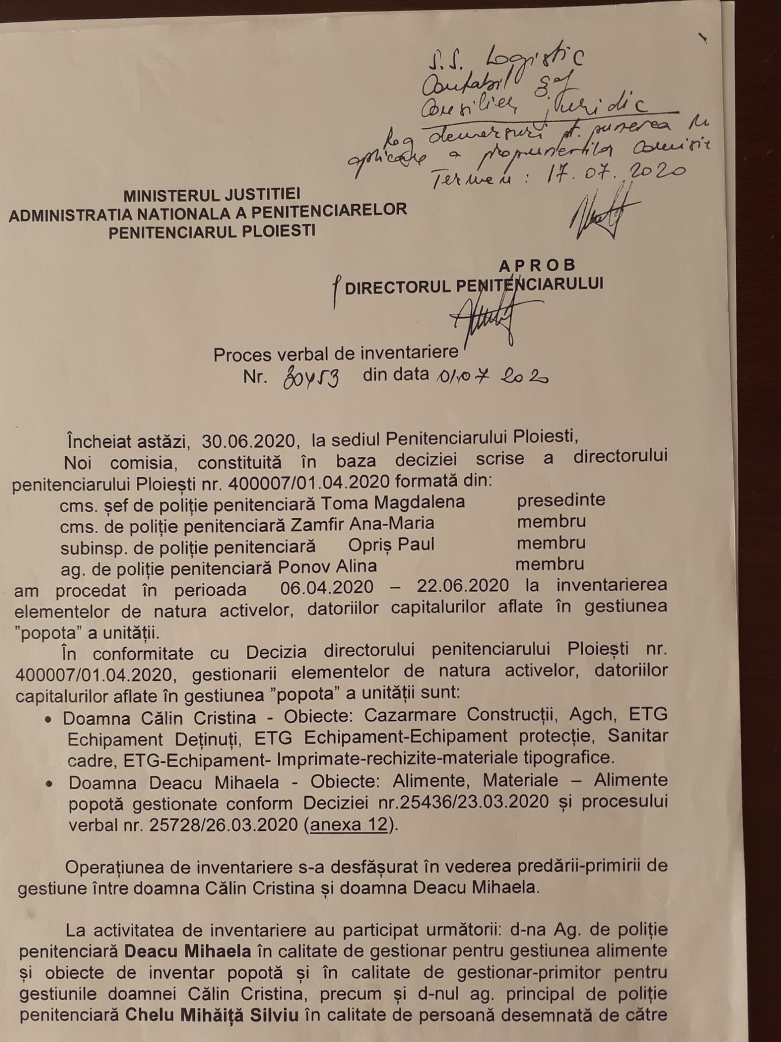 1.,, Noi comisia, constituită în baza deciziei scrise a directorului penitenciarului Ploiești nr. 400007/01.04.2020 am procedat în perioada 06.04.2020 – 22.06.2020 la inventarierea elementelor de natura activelor, datoriilor capitalurilor aflate în gestiunea ”popota” a unității.”