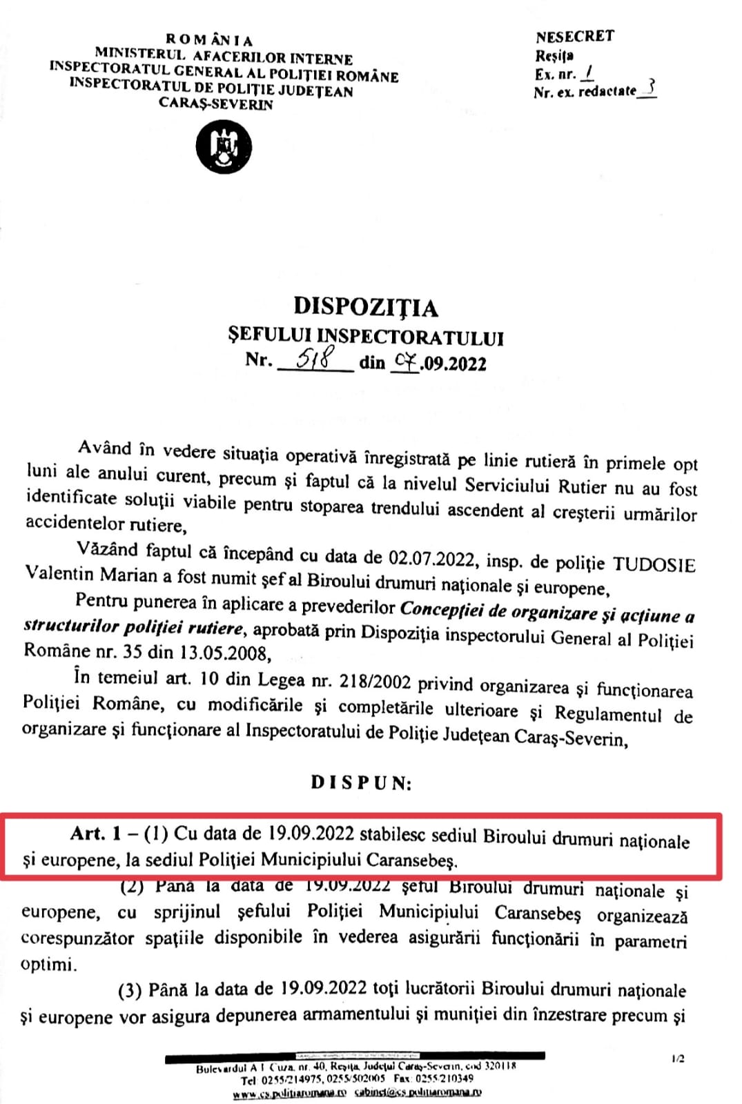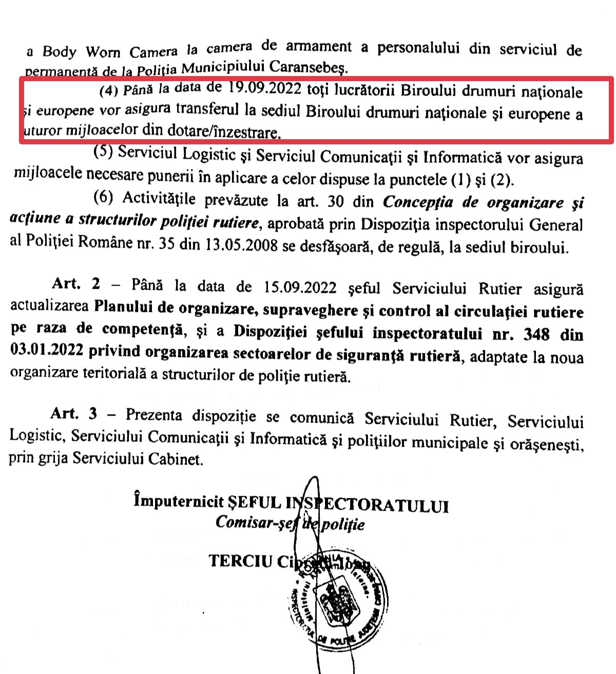 Pentru a-și duce amenințările la bun sfârșit, întrucât comisarul șef de poliție Coman Aurel coordonează activitatea de ordine publică și rutieră, la nivelul IPJ Caraș-Severin este emisă Dispoziția cu nr. 518 din 07.09.2022 în baza căreia, sub pretextul creșterii numărului de accidente rutiere, Biroul Drumuri Naționale și Europene ce avea sediul în incita Poliției Orașului Băile Herculane este mutat în sediul Poliției Muncipiului Caransebeș ce este situat la o distanță de 75 de km de localitatea Băile Herculane, astfel încât polițiștii să fie nevoiți să piardă aproximativ o oră pentru a se echipa și pentru a li se efectua instructajul premergător intrării în serviciu, fiind astfel ”poziționați” la o distanță considerabilă față de patronii firmelor ”preferențiale” care distrug drumurile publice prin intermediul mașinilor de mare tonaj.