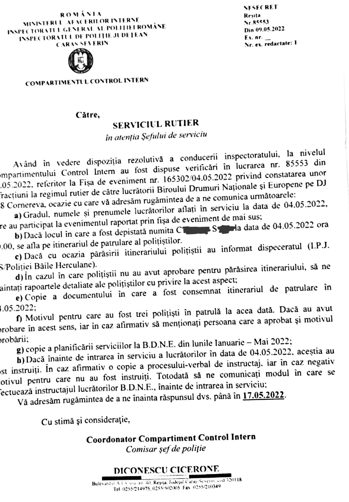 O astfel de practică rezultă inclusiv din adresa de mai jos din care puteți observa că polițiștii sunt cercetați pentru că au întocmit un dosar penal pentru conducerea unui vehicul neînmatriculat pe drumurile publice și inclusiv fără permis de conducere, soției unui șef de Ocol silvic, apropiat al șefilor din poliție, prin prisma disponibilității pe care o are pentru găzduirea petrecerilor organizate de aceștia, departe de ochii lumii.
