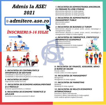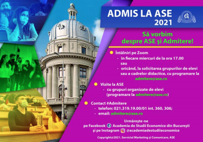 Pentru întrebări și informații detaliate despre Admitere și ASE, candidații au la dispoziție paginile instituționale Admitere Licență 2021, Facebook, Grup oficial Admitere 2021,Instagram. Timpul este tot mai scurt, de aceea ASE desfășoară întâlniri săptămânale online cu candidații, sub genericul Admis la ASE, 2021!, miercurea, începând cu ora 17:00, la https://ase.zoom.us/j/88455955563.