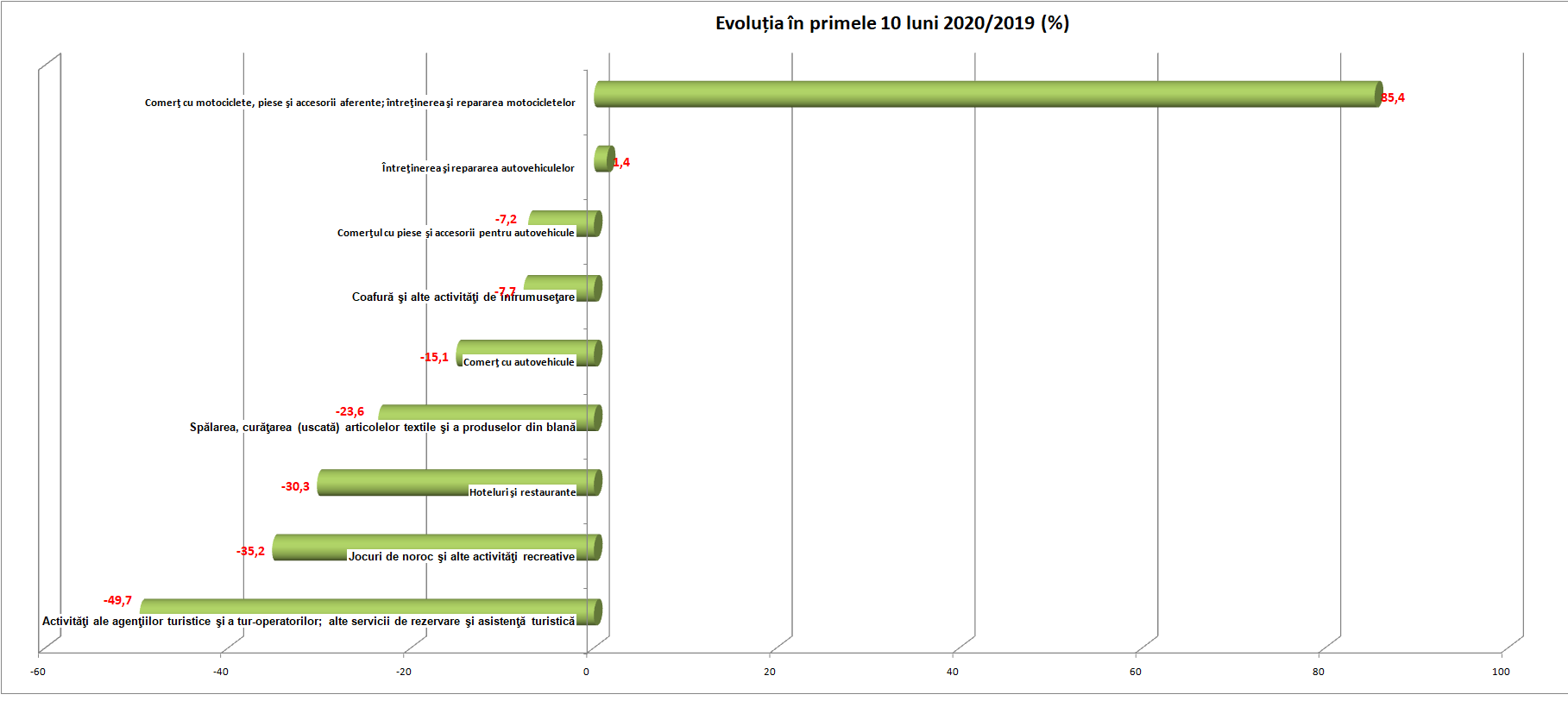 Comerțul cu mașini a scăzut în primele 10 luni din acest an față de perioada similară din 2019 cu mai mult de 15%, arată datele transmise miercuri de Institutul Național de Statistică. Cel mai mare recul a fost cel din domeniul turismului, agențiile turistice vâzându-și redusă activitatea la jumătate. De asemenea, un alt perdant a fost businessul jocurilor de noroc. Marele câștigător a fost comerțul cu motociclete, care aproape că s-a dublat. Frizeriile și coafurile sunt la peste 90% din bisunessul de anul trecut, iar service-urile auto sunt cu puțin peste 100% din cât realizaseră în primele 10 luni din anul trecut.