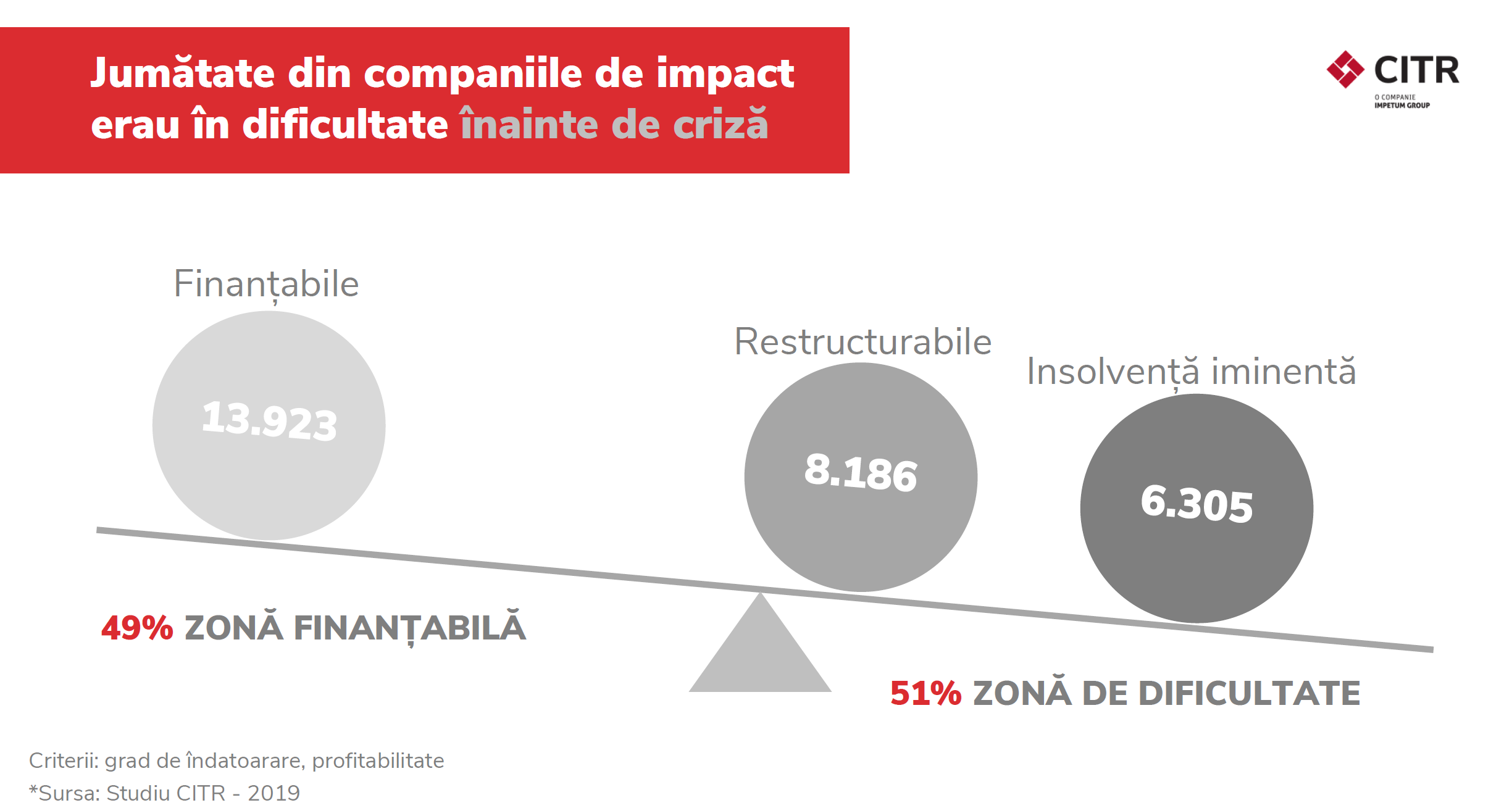 România are aproape 30.000 de companii de impact, fiecare cu active de peste 1 milion de euro. Un stress test efectuat de CITR arată că procentul companiilor de impact aflate în dificultate (restructurabile și insolvabile) ar crește de la 51% (cât era la începutul anului 2019) la 70% în situația unei crize financiare. Asta înseamnă 21.000 de companii care s-ar putea afla într-o stare de dificultate în perioada următoare.