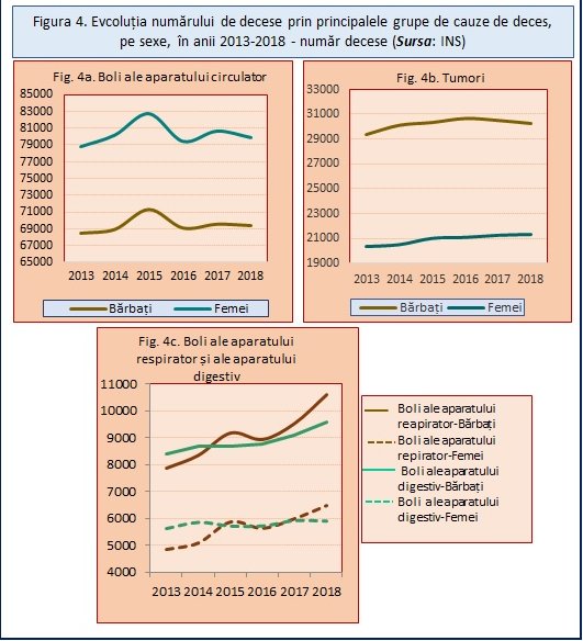 O privire asupra schimbărilor pe care le-a cunoscut mortalitatea prin principalele grupe de cauze de deces aduce elemente utile cunoașterii stagnării creșterii speranței de viață (figura 4). Numărul deceselor s-a majorat în anii 2014-2015 prin toate grupele importante de cauze de deces, atât la bărbați cât și la femei. A urmat un recul în anul 2016, având carcateristică compensatorie, la decesele provocate de boli ale aparaului circulator, respirator și digestiv dar nu și la decesele prin tumori. Evoluția din anul 2018 este contradictorie: ușor recul la decesele prin boli ale aparatului circulator la bărbați, stagnare la femei, recul ușor la decesele prin tumori la bărbați și progres minor la femei, pentru a asista la ascensiune clară a numărului de decese prin boli ale aparatului respirator la întreaga populație și prin boli ale aparatului digestiv la bărbați. După anul 2016 a intervenit și o schimbare de poziție între decesele prin boli ale aparatului respirator și celui digestiv, în favorea primelor cauze. Ceaa ce a rezultat din toate aceste mișcări este un număr mai mare de decese în anul 2018 comparativ cu anul 2013 la toate cele patru grupe mari de cauze de deces și la bărbați și la femei.