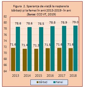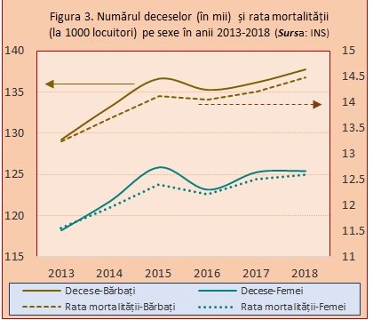 Stagnarea creșterii speranței de viață la bărbați și cvasi-stagnarea de la populația feminină s-ar fi transformat în declin dacă efectele negative ale creșterii moderate a mortalității după vârsta de 60 de ani nu ar fi fost compensate de reculul moderat al mortalității și la bărbați și la femei la vârstele de 15-19 ani. Decalajul dintre speranța de viață la naștere a femeilor și bărbaților era de 7 ani în anul 2013 și s-a mărit la 7,2 ani în ani 2017 și 7,4 ani în anul 2018, fiind cu peste 2 ani superior celui de la nivelul populației UE28. Se cuvine a preciza că stagnare și chiar ușor recul conjunctural al speranței de viață la naștere pot fi întâlnite și în țările dezvoltate în unii ani prin efectele unor epidemii de gripă foarte severe dar ascensiunea speranței de viață este apoi reluată (Pison, 2019).