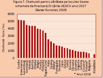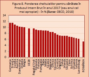 Putem înțelege mai bine și nivelul scăzut al speranței de viață la naștere și schimbările din ultimii ani dacă privim contextul național al resurselor financiare orientate spre programele de sănătate în țările Uniunii Europene în figurile 7, 8 și 9 (plasate în Anexă). Cu un nivel al cheltuielilor pentru sănătate de 494 Euro pe locuitor în anul 2017 și o pondere a cheltuielilor pentru sănătate în Produsul Intern Brut de numai 5,2 la sută în același an, România ocupă cea mai nefavorabilă poziție. În figura 9 pot fi examinate pozițiile țărilor din Uniunea Europeană după nivelul speranței de viață la naștere și al cheltuielilor pentru sănătate pe locuitor. Prudența se impune în căutarea corelațiilor, valorile speranței de viață în anul 2017 fiind rezultatul evoluțiilor economice, sociale, culturale și medicale de lungă durată. Se poate însă comenta gruparea țărilor după cei doi indictori. Țările ex-comuniste (mai puțin Slovenia) se plasează în pozițiile cele mai nefavorabile, cu valori mai mici ale speranței de viață dar și ale cheltuielilor pentru sănătate. Se diferențiază însă în două grupe, A și B, în prima dintre ele plasându-se Bulgaria, Letonia, România, Lituania și Ungaria iar în cea de a doua grupă, cu valori mai ridicate ale speranței de viață și ale cheltuielilor, se află Slovacia, Polonia, Croația, Estonia și Cehia. În a treia grupă (C) găsim țările mediteraneene (mai puțin Croația), cu valori foarte ridicate ale speranței de viață chiar dacă nivelul cheltuielilor pentru sănătate nu se află la foarte mare distanță de cel din țările aflate în grupa B dar departe de nivelul din țările dezvoltate vest- și nord- europene (grupa D). Explicația valorilor foarte ridicate ale speranței de viață în țările din grupa C se află în calitățile dietei mediteraneene (“…consum zilnic de legume, fructe, cereale integrale și grăsimi sănătoase, pește, păsări de curte, fasole și ouă, consum moderat de produse lactate și limitat de carne roșie ”). De altfel, în acesată grupă se află cele două țări cu valorile cele mai ridicate ale speranței de viață la naștere – Italia (83,1 ani) și Spania (83,4 ani).