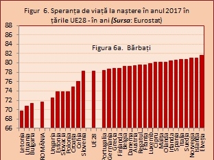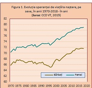 În figura 1 este prezentată evoluția speranței viață la naștere în țara nostră începând cu anul 1970. Pot fi distinse trei perioade având caracteristici diferite: cea din anii 1970-1989, cu tendința dominantă de regres la nivelului speranței de viață la bărbați și stagnare/progres minor și ezitant la femei; reculul drastic de după anul 1991 la bărbați și stagnare la femei; ascensiune importantă și aproape continuă după anul 1996 atât la bărbați cât și la femei. Voi menționa că regresul/stagnarea din partea a doua a anilor 1970 este reflexul direct al deteriorării contextului economic, social și politic, evoluții asemănătoare fiind vizibile și în alte țări ex-comuniste înainte de căderea regimurilor totalitare. Tranziția care a urmat și-a pus cu brutalitate amprenta pe nivelul de trai, pe serviciile sociale și asistența medicală, generând criză economică, instabilitate, incertitudine, climat social tensionat. Toate au dus la recudescența mortalității și la regresul pronunțat al speranței de viață la bărbați, stagnare și recul minor la mijlocul anilor 1990 la femei. Bărbații s-au dovedit a fi mai fragili la rigorile tranziției.