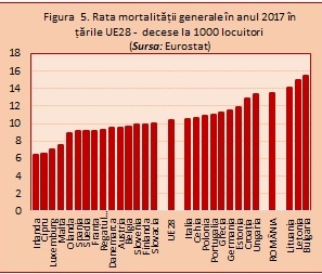 Ce schimbări au avut loc în poziția țării noastre în UE28 prin stagnarea creșterii speranței de viață la naștere? Diferența dintre speranța medie de viață la naștere în populația UE28 și cea din țara noastră s-a majorat moderat, de la 5,4 la 5,6 ani. Plasarea țării noastre după nivelul ratei mortalității generale și al speranței de viață la naștere în pozițiile cele mai nefavorabile printre țăarile din UE28 nu a suferit modificări (figurile 5 și 6). Ratei mortalității generale de 13,5 decese la 1000 locuitori îi corespunde o rată standardizată, care elimimă influențele structurilor pe vârste ale celor 28 de populații, de 14,8 decese la 1000 locuitori. Poziția deținută de țara noastră în clasamentul după nivelul speranței de viață la naștere este mai negativă la bărbați decât la femei, evoluțiile indicatorului din ultimi ani alimentând diferența.