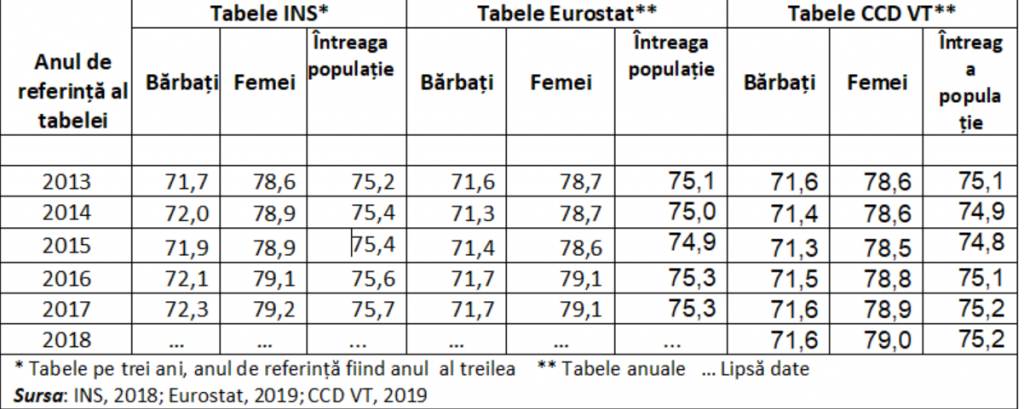 Valorile indicatorului din tabelele Eurstat și CCD VT sunt foarte apropiate. Datele asupra populației și deceselor pe vârste nu pot fi decât aceleași iar diferențele neînsemnate pot proveni din includerea/neincluderea în timp a datelor finale ale INS în locul celor semidefinitive, provizorii ori revizuite publicate de-a lungul anilor pentru toate tabelele de mortalitate ori din particularități metodologice de importanță secundară (metoda este bine statuată. Tabelele CCD VT pentru anii 2013-2018 sunt elaborate cu ultimele date disponibile la 29 octombrie 2019 în Bazele de Date Statistice TEMPO ONLINE ale INS. În schimb, valorile din tabelele INS au unele diferențe care nu pot fi neglijate în analiza comparativă a schimbărilor anuale, fiind în, cele mai multe cazuri, mai mari. Provenind din tabele de mortalitate elaborate prin luarea în considerare a deceselor pe vârste din trei ani calendaristici, și semnificația speranței de viață la naștere estea cea a valorii medii anuale în cei trei ani. În plus, valoarea este atributiă celui de al treilea an. Din aceste rațiuni analiza schimbările survenite în ultimii ani în evoluția mortalității și a speranței de viață la naștere se referă indicatori din tabelele anuale de mortalitate Eurostat și CCD VT, pentru comparații la nivelul țărilor din UE28 și, respectiv, pentru evidențierea schimbărilor survenite după anul 2013 în mortalitatea pe sexe, pe vârste și pe grupe mari de cauze de deces în țara noastră.