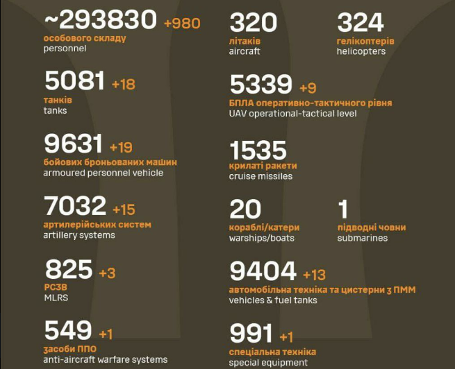 La capitolul echipamente, armata rusă ar fi rămas ieri pe front fără 18 tancuri, 19 alte blindate, 15 piese de artilerie, 3 lansatoare multiple de rachete, 1 sistem antiaerian, 1 echipament special și 13 diferite vehicule.