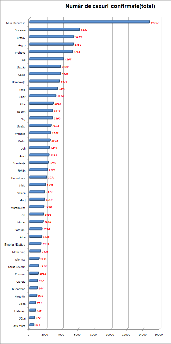 Ca număr total de cazuri confirmate, Capitala e în frunte, dar e urmată de Suceava, Brașov, Argeș și Prahova. Graficul, mai jos: