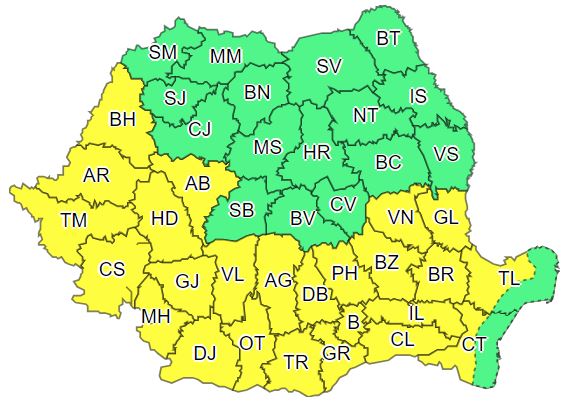 Valul de căldură se extinde joi în vestul, sudul și sud-estul țării, unde va fi caniculă, disconfort termic ridicat, iar indicele temperatură-umezeală (ITU) va depăși pragul critic de 80 de unități. Temperaturile maxime se vor situa în general între 33 și 37 de grade, iar cele minime între 18 și 25 de grade.