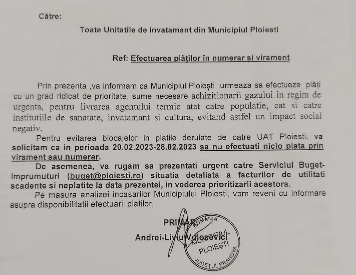 Scolile din Ploiești s-au trezit cu banii retrași din conturi, după care au primit o adresă semnată de primarul Andrei Volosevici. În document, directorilor de școli le este transmis mesajul ”Să nu efectuați nicio plată” pentru că primăria trebuie să cumpere gazele necesare agentului termic, asa cum Incisiv de Prahova a dezvaluit, in EXCLUSIVITATE!