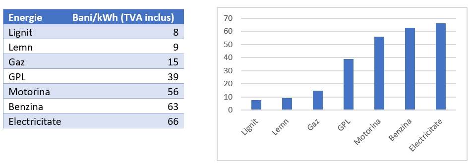 Adaug la comparație și energia electrică care, deși este o forma de energie superioară celorlalte (poate fi transformată direct și cvasi-integral în lucru mecanic) poate de asemenea să fie transformată în căldură, să zicem printr-un calorifer electric. Aici unitatea de măsură folosită este kWh și prețul l-am luat de pe factura de acasă.