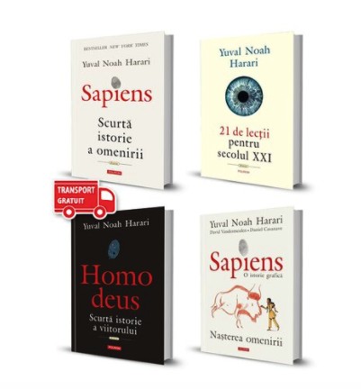 - Pachet complet Yuval Noah Harari. Set 4 cărți: putem spune că pe bună dreptate este unul dintre cei mai populari autori la momentul respectiv. Pachetul cuprinde cărți în care se prezintă istoria omenirii într-o manieră nouă, atractivă și ușor de înțeles, dar și previziuni despre viitorul omenirii, bazate pe istorie.