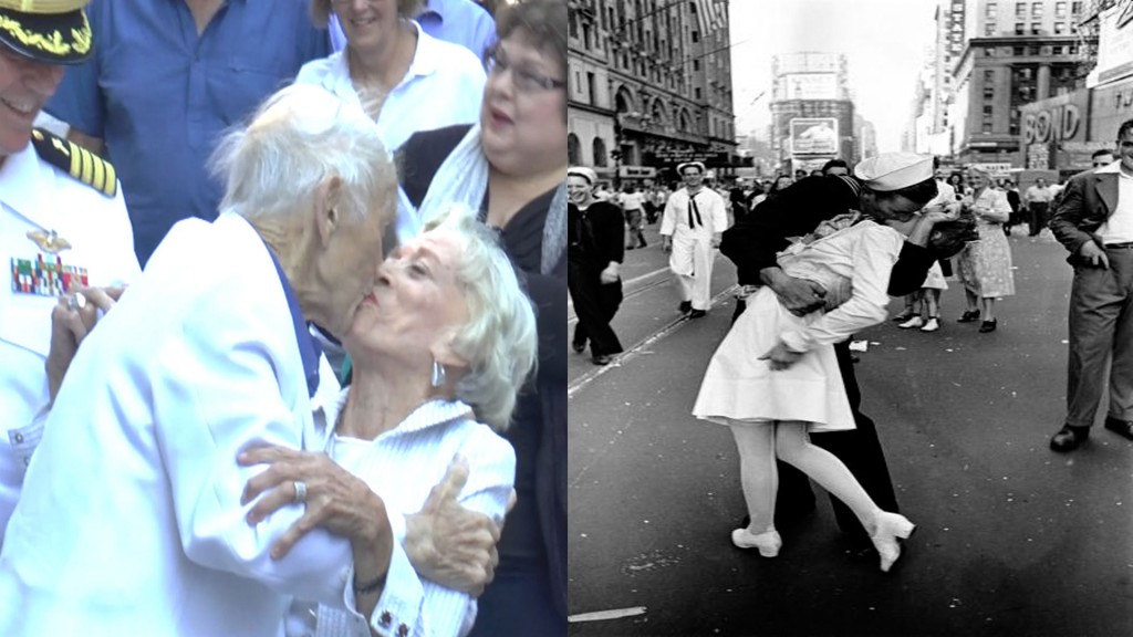 Scena sărutului va rămâne de atunci un simbol al bucuriei acelor momente. Din unele surse, se pare că sărutul de la care a pornit reconstituirea a avut loc la 14 august 1945, după ce anunţul privind capitularea Japoniei a fost făcut public. Atunci, un marinar a sărutat o asistentă pe care nu o cunoştea, iar fotografia care a surprins momentul a făcut în scurt timp înconjurul lumii. În ceea ce priveşte identitatea protagoniştilor momentului, există multe versiuni iar cea oficială nu a fost stabilită niciodată.