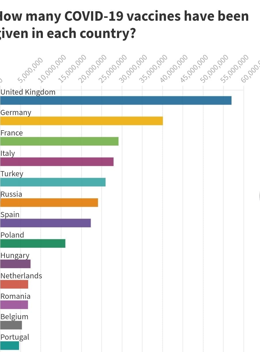 Pe primul loc în ceea ce privește numărul total al vaccinurilor administrate se plasează Marea Britanie, urmată de Germania, Franța, Italia, Turcia, Rusia, Spania, Polonia, Ungaria, Olanda, România, Belgia, Portugalia. La polul opus, pe ultimele locuri figurează Islanda, Moldova, Luxembourg, Belarus, Cipru, Letonia, Estonia, Albania, Slovenia, Ucraina și Bulgaria.