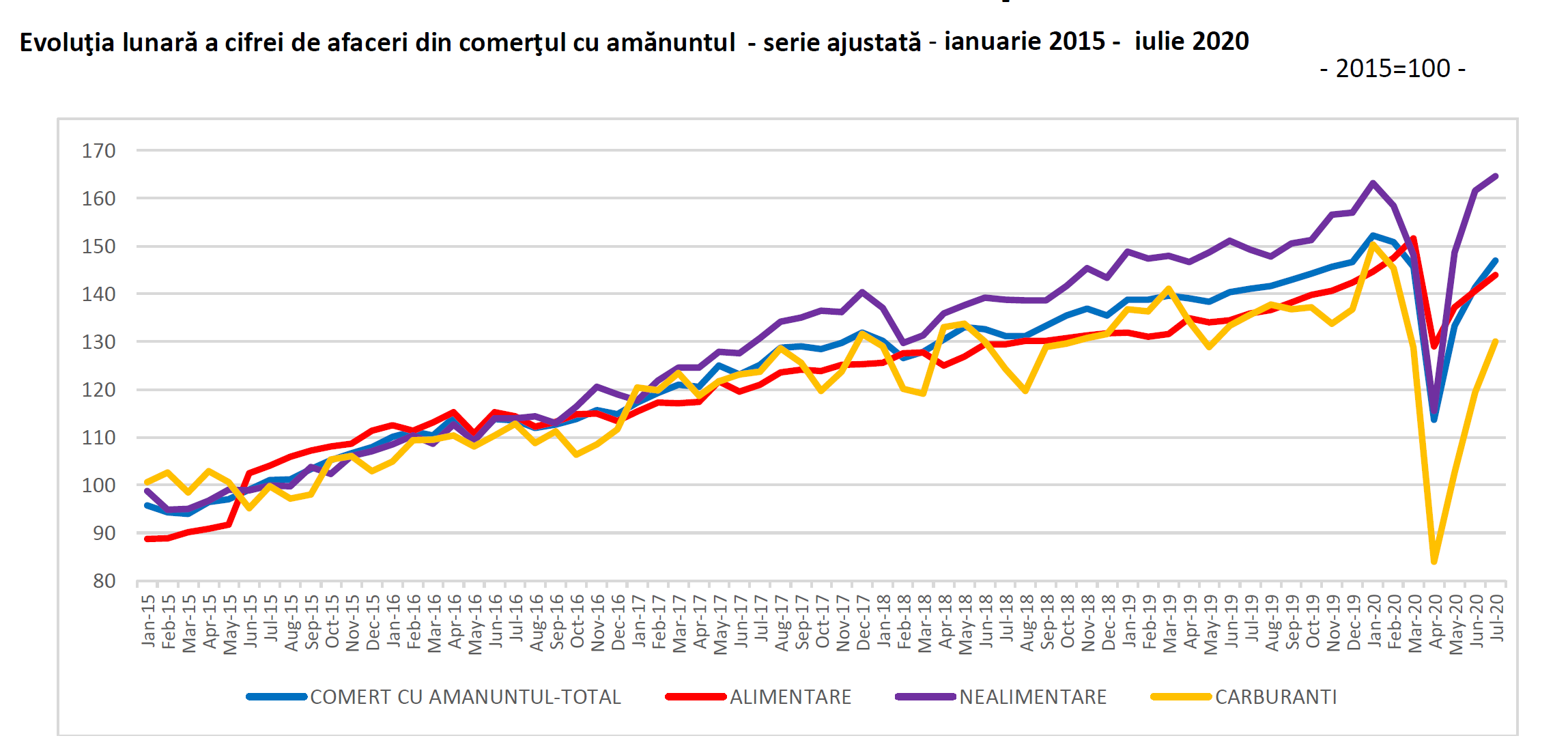 Comerţul cu amănuntul în luna iulie 2020, comparativ cu luna precedentă, a crescut pe ansamblu cu 10,3% datorită creșterilor înregistrate la comerţul cu amănuntul al carburanţilor (+24,6%), vânzările de produse nealimentare (+6,9%) și la vânzările de produse alimentare, băuturi şi tutun(+6,3%).