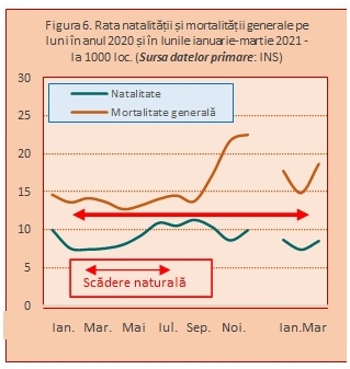 În figura 6 poate fi examinată întreaga evoluție pe luni în anul 2020 și în primele trei luni din acest an, cu incredibila explozie din ultimele trei luni ale anului 2020. Se poate remarca, dramaticei majorări a numărului de decedați i s-a adăugat declinul numărului de născuți. Nu putem ști acum dacă acest declin al născuților a fost conjunctural, dacă este rezultatul unei tendințe noi de scădere a numărului de născuți ori este începutul concretizării deciziilor tinerelor cupluri de renunțare sau de amânare a venirii copilului pe lume luate în contextul pandemiei. Iată imensul cost demografic de până acum al pandemiei.