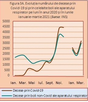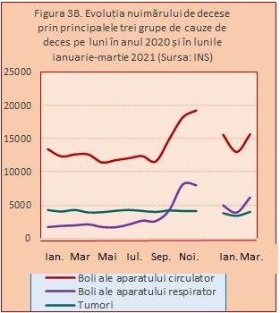 Și în creșterea numărului de decese prin boli non-Covid 19 ale aparatului respirator constatăm aceeași plasare în lunile de majorare considerabilă a deceselor prin virus, însemnând aceeași determinare comună iar în figura 3A se poate observa dinamica aproape identică a deceselor prin cele două componente ale bolilor aparatului respirator. În perioada martie 2020-martie 2021 decesele prin Covid-19 au fost în număr de 23532 iar cele prin celelalte boli ale aparatului respirator au fost cu 2800 mai multe. Ascensiunea considerabilă a deceselor prin boli ale aparatului respirator în a doua jumătate a anului 2020 a produs o schimbare spectaculoasă în structura mortalității pe cauze de deces după luna octombrie: instalarea deceselor prin bolile aparatului respirator pe a doua poziție în ansamblul deceselor, după cele prin boli ale aparatului circulator, prin depășirea numărului de decese prin tumori (figura 3B). Este o schimbare temporară, se va reveni la cea statuată de foarte multă vreme, odată cu regresul deceselor prin coronavirus dar va fi instructiv de văzut felul în care va evolua mortalitatea prin bolile respiratorii non-Covid și măsura în care va fi dependentă de contextul descendent al infectărilor și deceselor prin noul virus, apreciat a fi cel care i-a favorizat ascensiunea.
