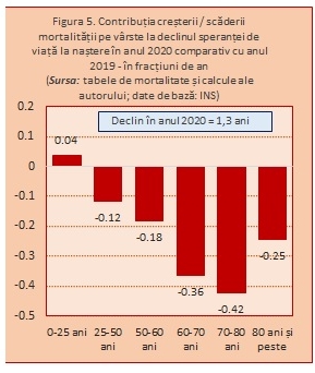 La nivelul întregului an, speranța de viață a fost de 74,2 ani, însemnând un declin de 1,3 ani comparativ cu nivelul din anul 2019. Și în luna ianuarie 2021 indicatorul a fost sensibil marcat de nivelul ridicat al mortalității, înscriindu-se apoi în luna februarie în progres apreciabil, în contextul reducerii mortalității, tendință care este de așteptat să continue în lunile următoare. Instrumentele analizei demografice permit cuantificarea contribuției avute la regresul de 1,3 ani al speranței de viață în anul 2020 creșterea mortalității pe vârste comparativ cu anul precedent și în figura 5 se poate remarca contribuția predominantă avută de creșterea mortalității la vârstele cele mai afectate de pandemie, 60-69 și 70-79 ani. Se poate observa și efectul pozitiv, chiar dacă minor, avut de reducerea mortalității la vârstele tinere, până la 25 ani.