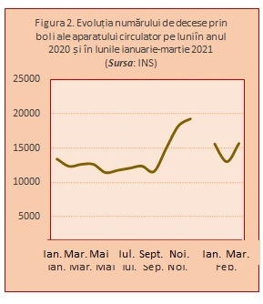 Revenind la evoluția numărului de decese pe luni în anul 2020 și în primele trei luni din anul 2021 prin toate cauzele de deces, prin Covid-19 și prin ansamblul cauzelor non-Covid prezentată în figura 1, datele publicate de Institutul Național de Statistică permit identificarea cauzelor de deces din marea grupă a cauzelor non-Covid unde s-au înregistrat creșteri considerabile și neașteptate în a doua parte a anului 2020: boli le aparatului circulator și, aparent surprinzător, alte cauze ale aparatului respirator decât noul virus. Decesele prin bolile aparatului circulator dețin o imensă pondere în mortalitatea din țara noastră – 55 la sută în anul 2020 și recrudescența acestor decese are contribuția cea mai mare în ansamblul majorării numărului de decese. Ce apare particular în anul 2020 este creșterea acestor decese în aceleași luni în care ascensiunea deceselor prin coronavirus a fost cea mai ridicată (figura 2), însemnând o determinare provenind din același complex context al pandemiei.
