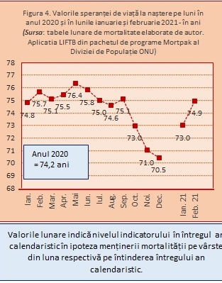 Urmarea firească a creșterii considerabile a mortalității în perioada pandemiei este regresul speranței de viață la naștere. Pe luni, reculul a fost deosebit de mare în lunile octombrie, noiembrie și decembrie (figura 4).